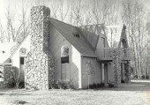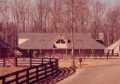 This is the 1981 NFBA Building of the Year Award Winner! This is an eight-stall stable with a detached guest house near Richmond, VA. Both have stone and cedar siding with a slate roof. The equipment building is to the left and the detached guest house is to the right.